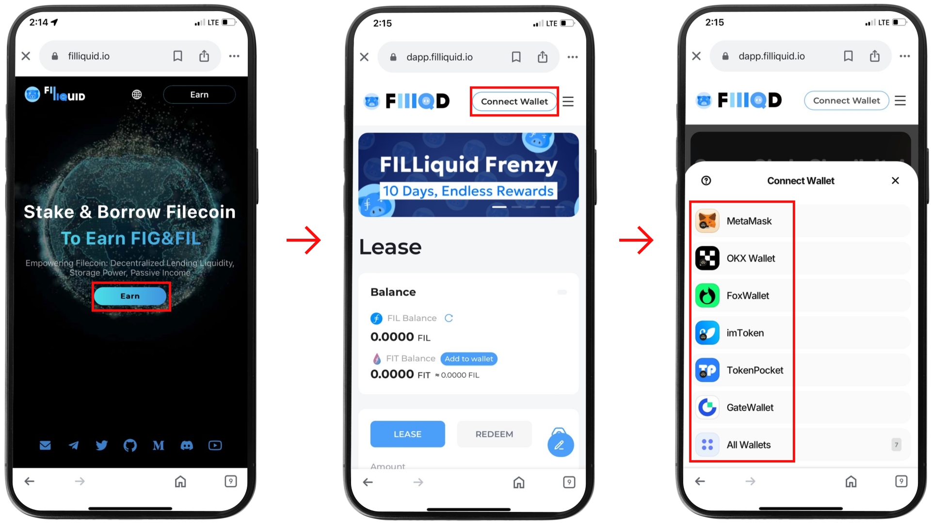 - ๋ชจ๋ฐ์ผ ๋ธ๋ผ์ฐ์ ์์ FILLIQUID ์ ์ ํ, ์ฐ์ธก ์๋จ์ "์ง๊ฐ ์ฐ๊ฒฐ (Connect Wallet)" ๋ฒํผ(๋นจ๊ฐ ๋ฐ์ค)์ ๋๋ฆ ๋๋ค.
