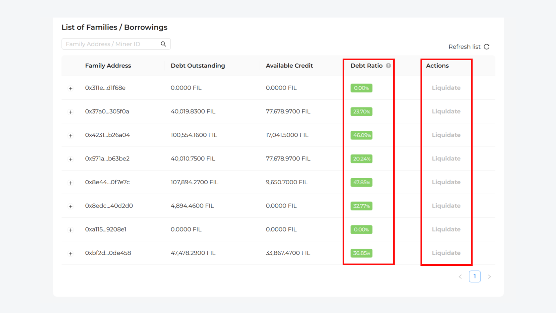 The liquidation mechanism refers to the debt liquidation line that will be triggered when the sum of the total borrowing, lending principal, and interest relative to the sum of the balances of each miner in the Family reaches a certain threshold (currently set at85%).