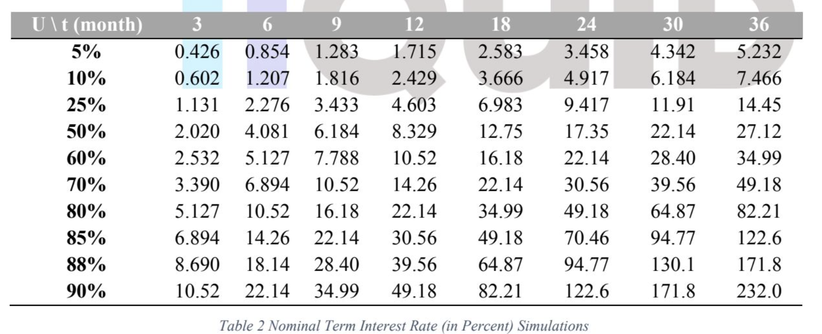 当借款人请求偿还贷款时，本金和利息将通过智能合约一起偿还。以下表格显示了一些模拟的利率（以百分比表示）。例如，假设一个存储提供商（SP）以50%的利用率借款，名义年利率为8%（如上表所示），并计划在36个月内偿还贷款。在这种情况下，他们需要支付27.12%的本金作为利息。